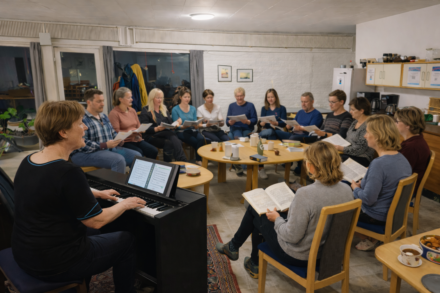 Vi mødes og synger fra højskolesangbogen omkring klaveret